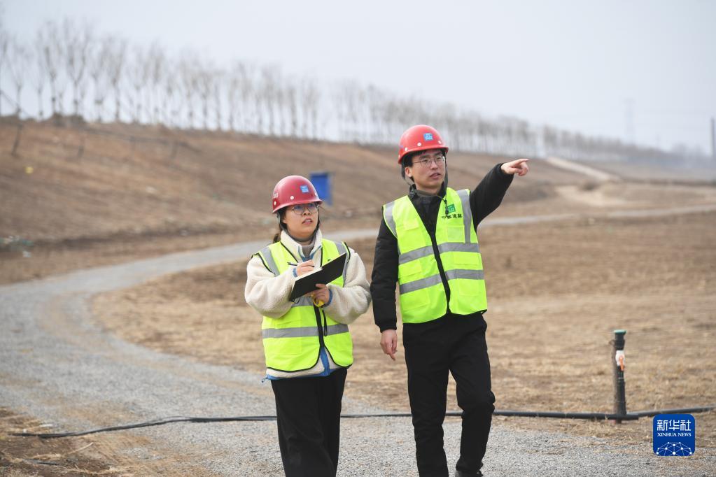 楊鑫博(左)和同事在雄安唐河河谷郊野公園項目現場工作(2月15日攝)。