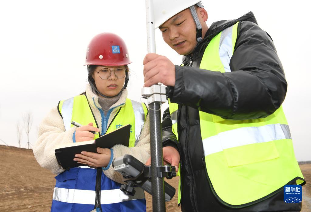 楊鑫博(左)和同事在雄安唐河河谷郊野公園項目現場勘測(2月15日攝)。