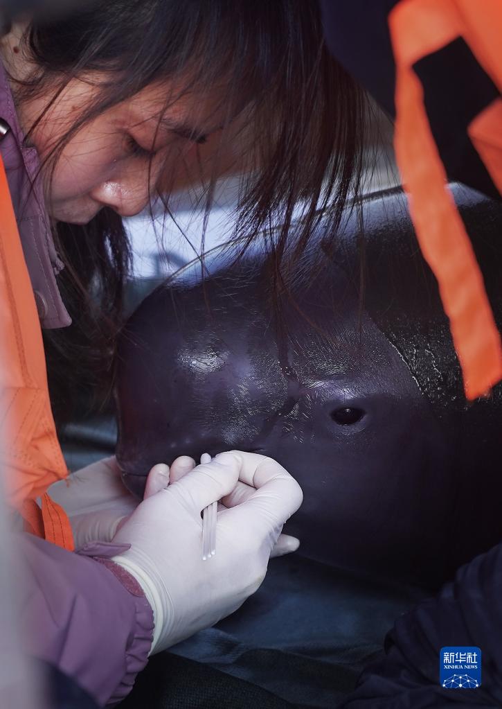 在江西鄱陽湖松門山水域,科研人員在船上為江豚進行體檢(2月15日攝)。