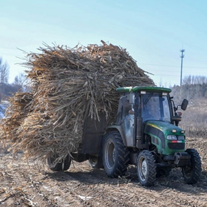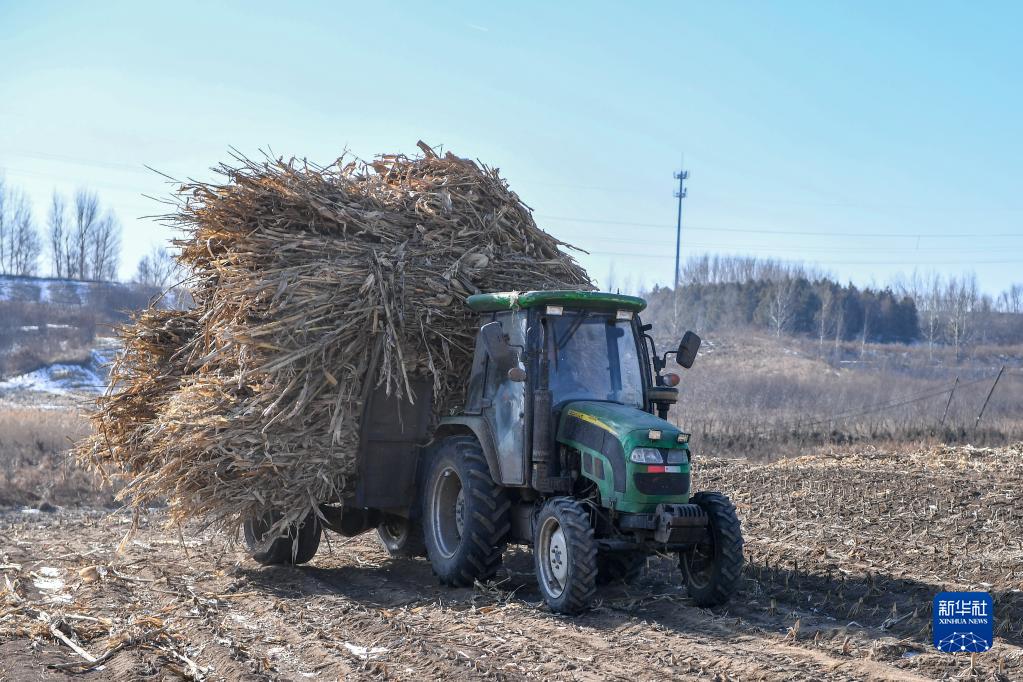2月16日,在吉林省長春市九臺區東湖街道腰站村,隆達興養殖農民專業合作社農民駕駛農機運輸玉米秸稈。