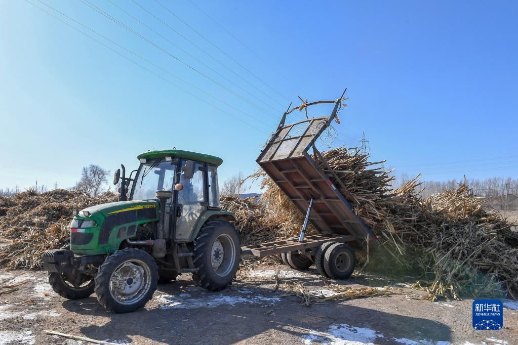 2月16日,在吉林省長春市九臺區東湖街道腰站村,隆達興養殖農民專業合作社農民將玉米秸稈卸到場院。