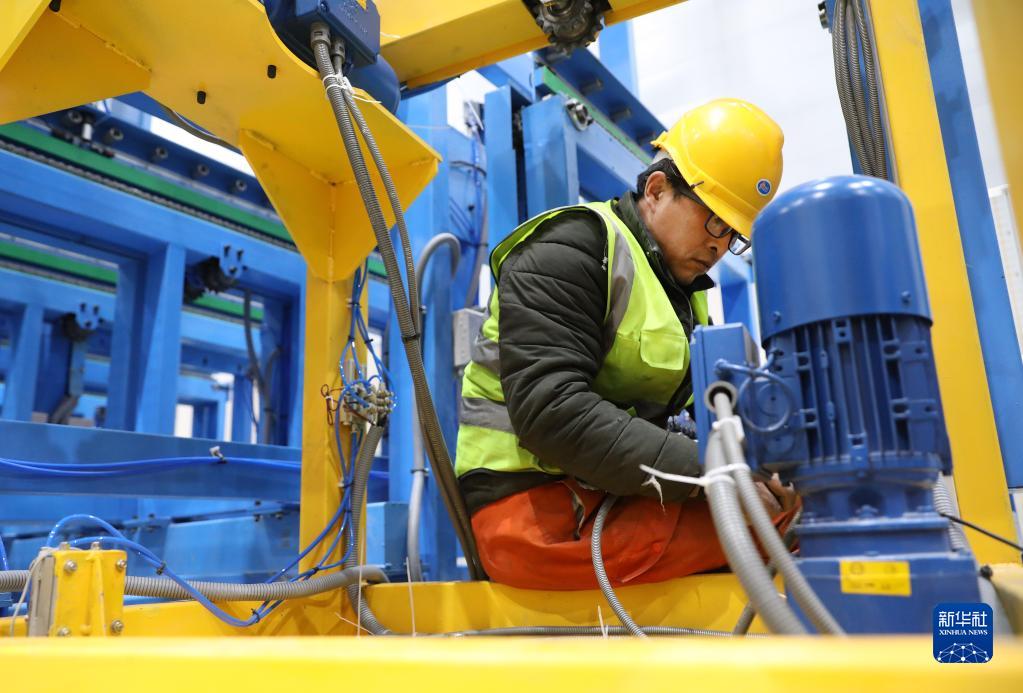 2月16日,工人在即將完工的特高壓套管研制基地內進行設備安裝。