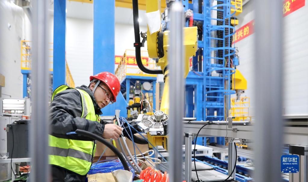 2月16日,工人在即將完工的特高壓套管研制基地內進行設備安裝。