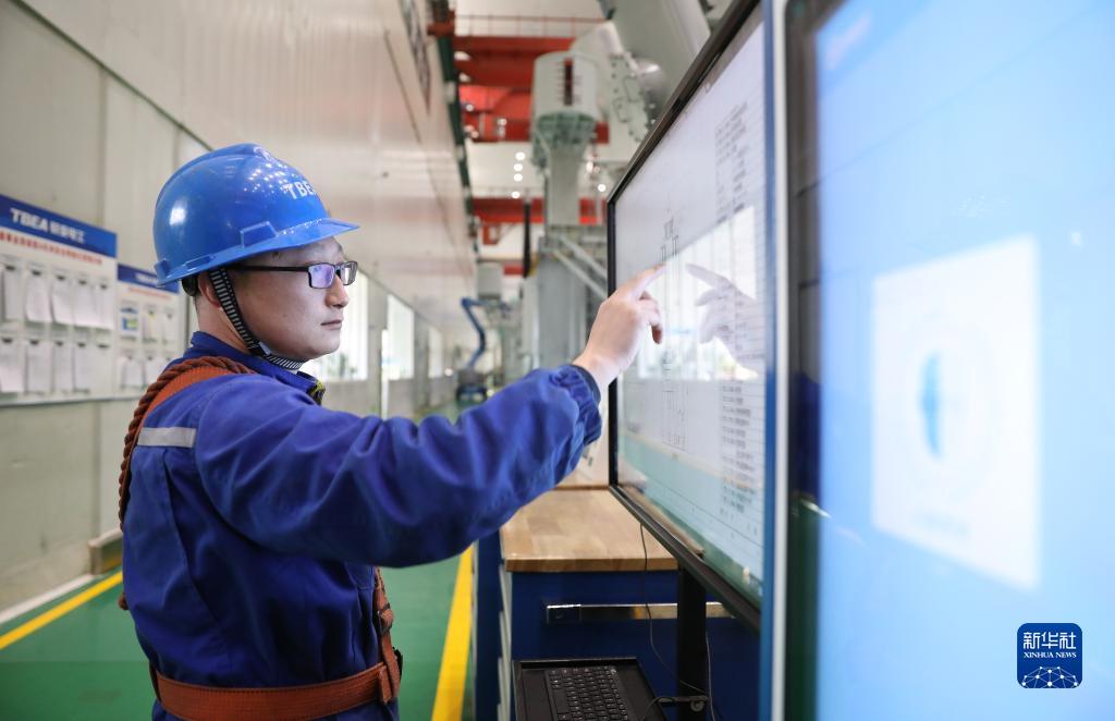 2月16日,一名工人在車間內電腦上進行設備組裝調度。