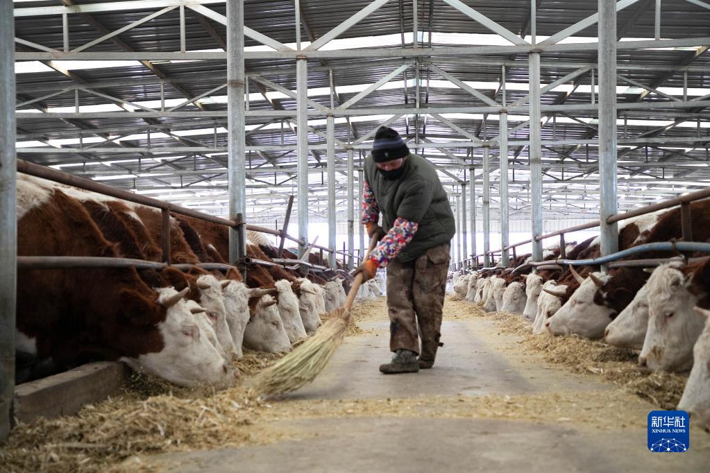 這是在古浪縣西靖鎮肉牛養殖基地拍攝的牛棚內景象(2月15日攝)。