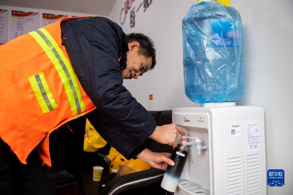 2月16日,在汨羅市歸義鎮友誼河社區“暖心驛站”,一名環衛工在接熱水。