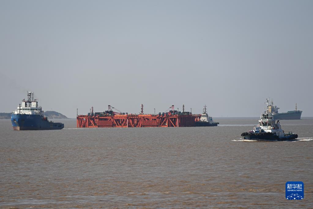 2月16日,拖船將甬舟鐵路西堠門公鐵大橋5號墩自浮式鉆孔平臺浮運到浙江舟山西堠門水道。