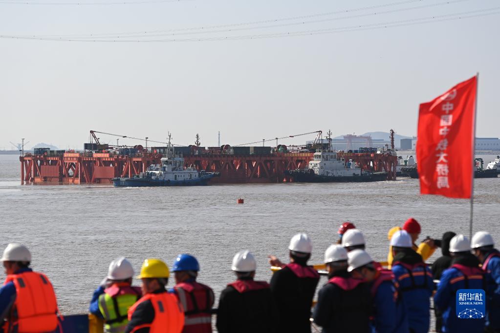 2月16日,中鐵大橋局技術人員在關注甬舟鐵路西堠門公鐵大橋5號墩自浮式鉆孔平臺浮運的位置。