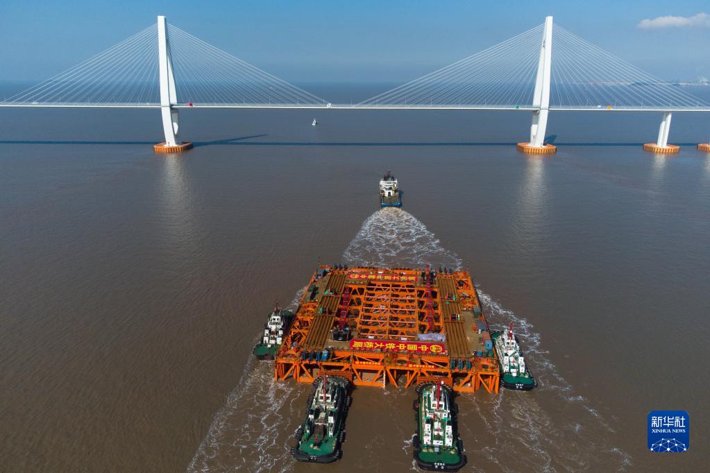 2月16日,甬舟鐵路西堠門公鐵大橋5號墩自浮式鉆孔平臺準備通過舟岱大橋主通航孔(無人機照片)。