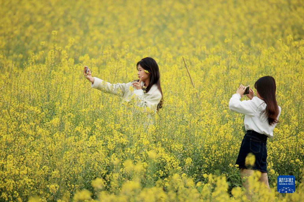 2月16日,游客在廣西柳州市融安縣浮石鎮橋頭村油菜花海中游玩。