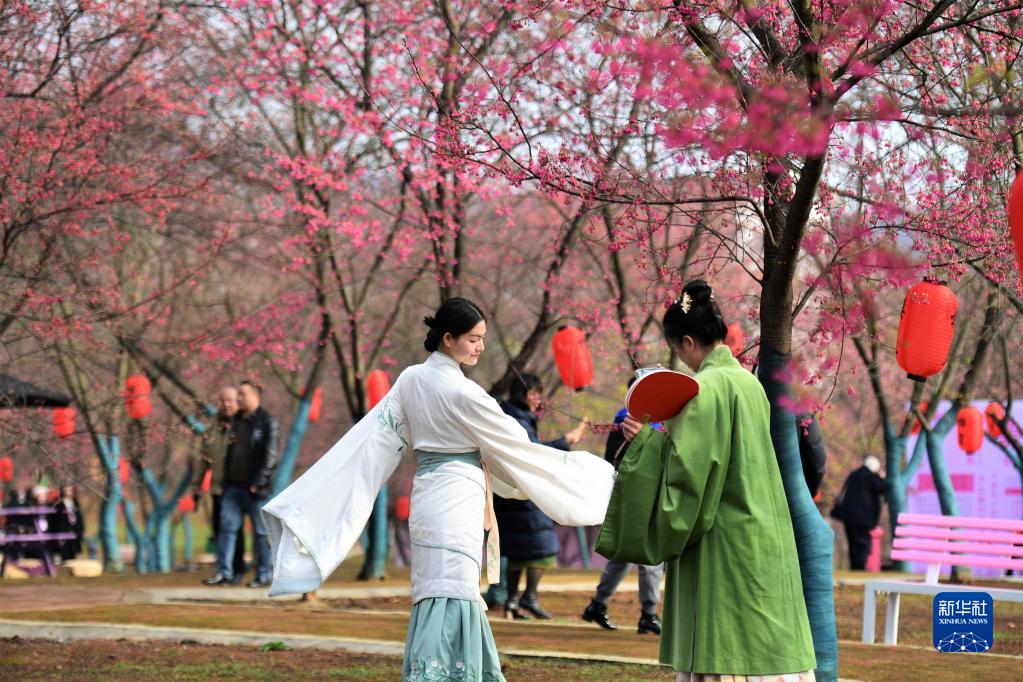 2月16日,游客在湖南省郴州市桂陽縣櫻花園賞花。