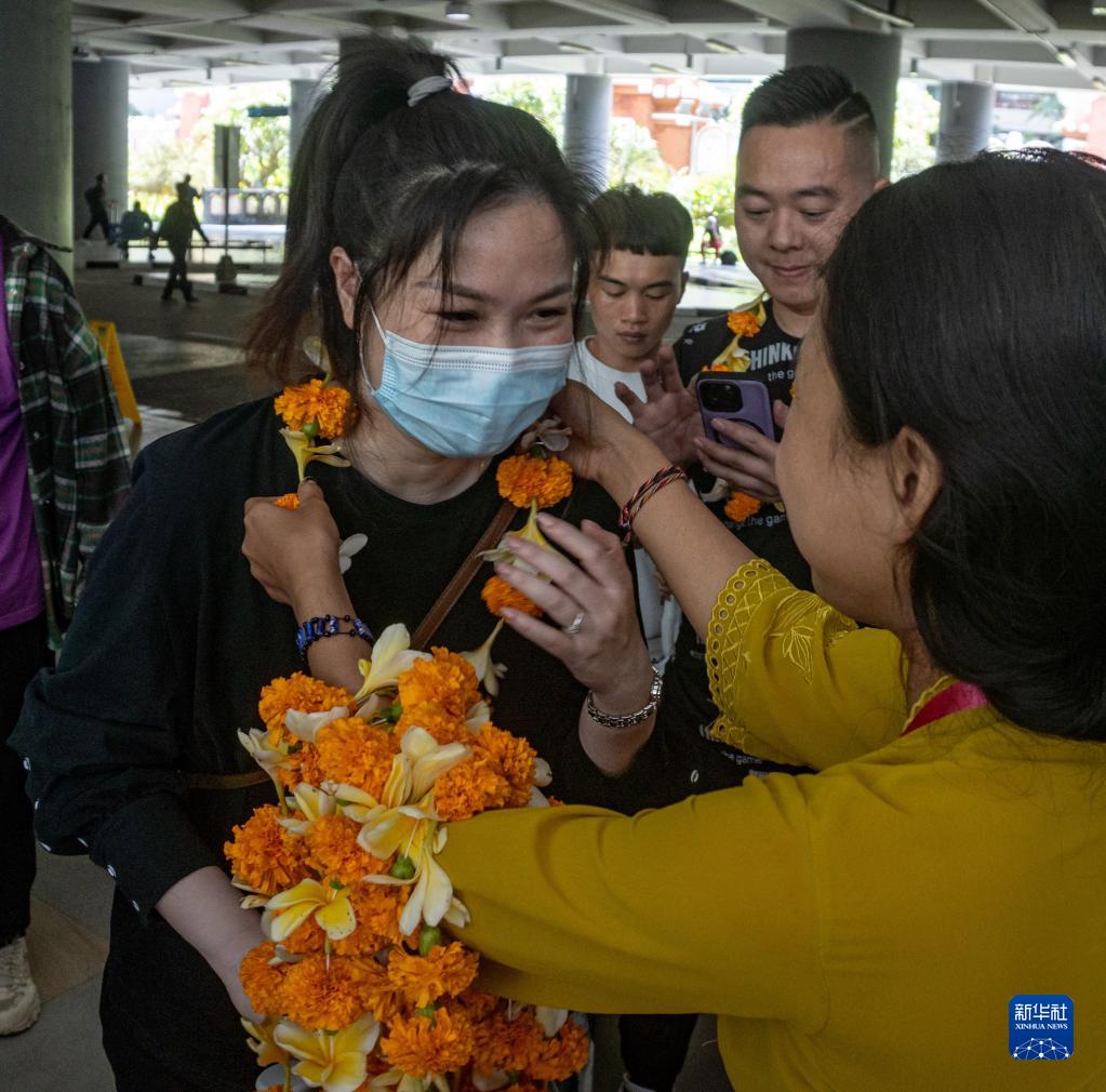 2月12日,在印度尼西亞巴厘島伍拉萊國際機場,工作人員為中國游客佩戴歡迎花環。