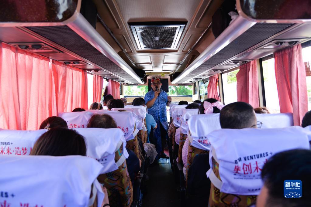 2月12日,在印度尼西亞巴厘島,當地導游(中)在從機場前往酒店的大巴車上向中國游客介紹巴厘島。