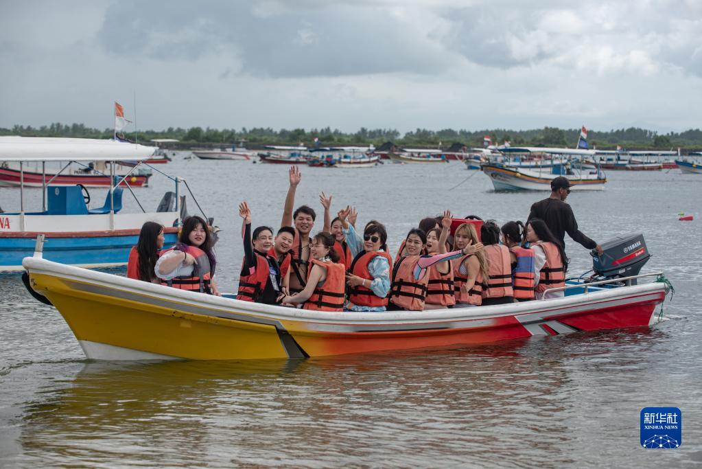 2月13日,中國游客在印度尼西亞巴厘島伯諾阿灣體驗水上娛樂項目。