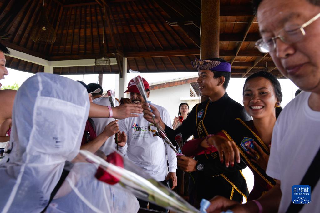 2月14日,在印度尼西亞巴厘省倫邦岸島,當地旅游業工作人員為中國游客送上鮮花。