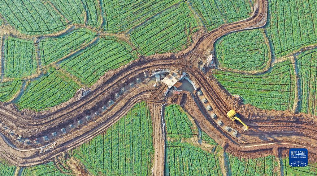 2月16日,在浙江省臺州市仙居縣雙廟鄉,工人在水渠及機耕道路施工現場施工(無人機照片)。