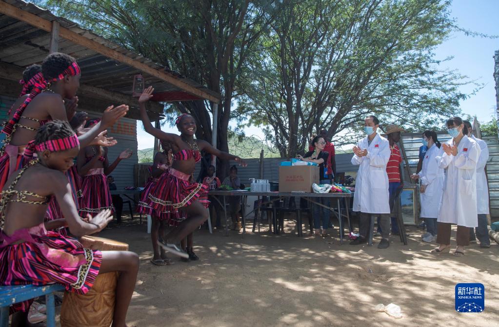 2月16日,在納米比亞首都溫得和克哈瓦那非正式定居點的弗蘭斯藝術培訓中心,同學們用傳統舞蹈感謝中國醫生。
