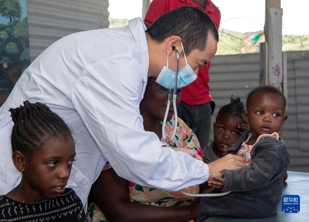 2月16日,在納米比亞首都溫得和克哈瓦那非正式定居點的弗蘭斯藝術培訓中心,中國醫生為一名兒童體檢。