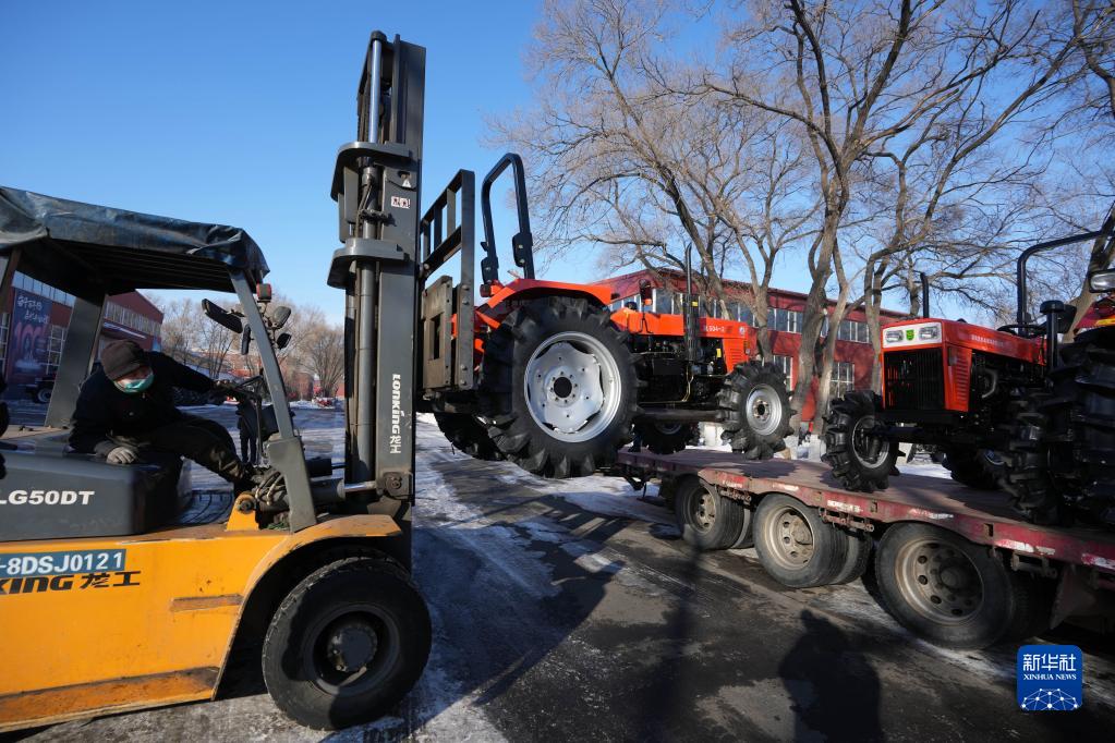 2月16日,佳木斯驥馳拖拉機制造有限公司大院,叉車向運輸車上運送拖拉機。