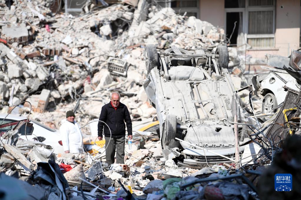 2月11日,一名男子從土耳其哈塔伊省安塔基亞市一處受損建筑物廢墟中走過。