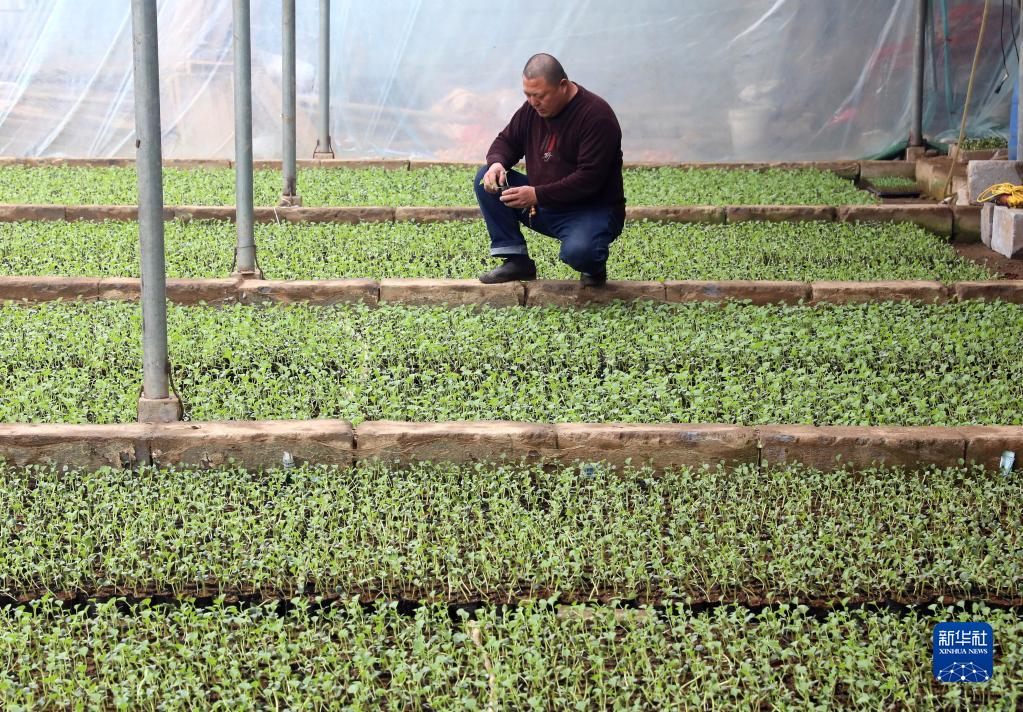 2月17日,在河北省石家莊市行唐縣翟營鄉溝北村甜瓜育苗基地,農戶查看甜瓜種苗生長情況。