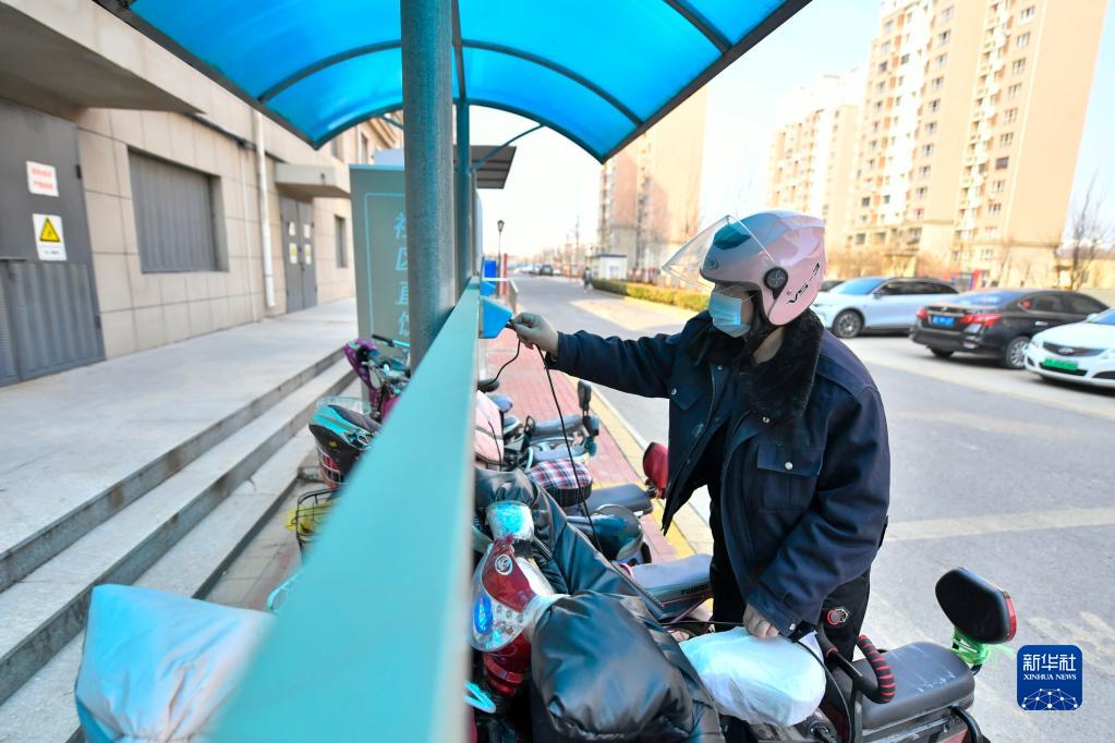 2月16日,天津市東麗區張貴莊街道華亭里社區躍麗家園小區居民將電動車停放在公共停車棚充電。