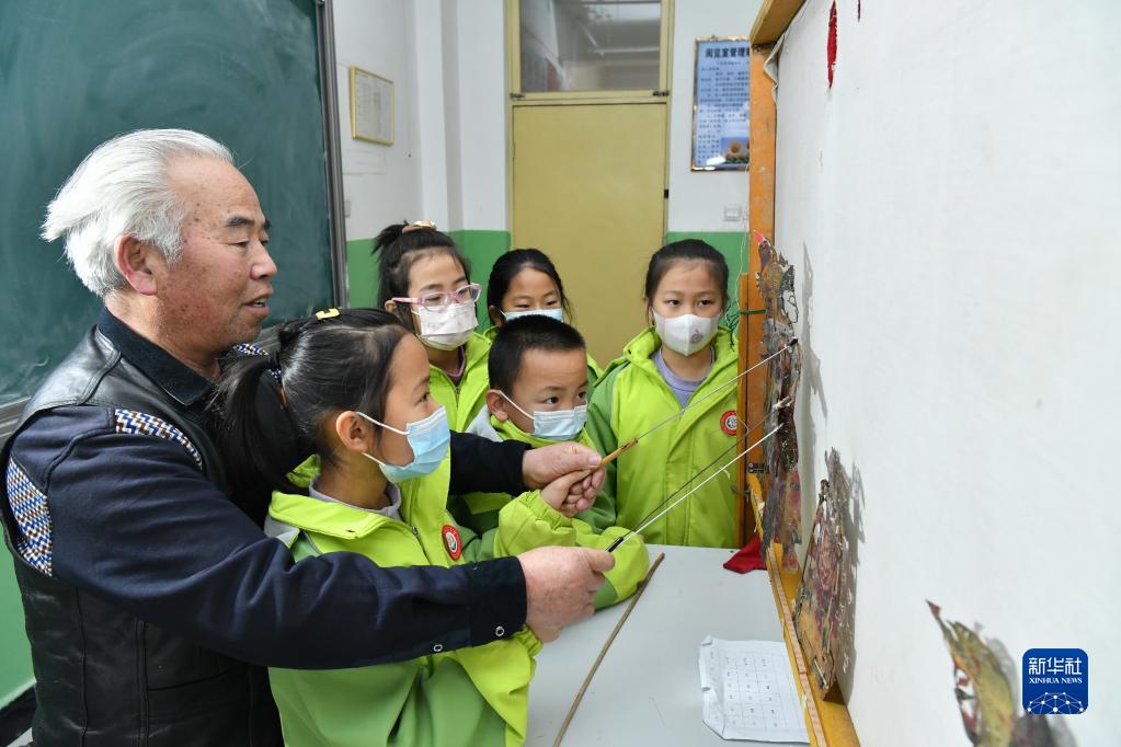 2月17日,張維宗(左一)在河北省獻縣段村鎮中心小學教授學生皮影戲表演技巧。