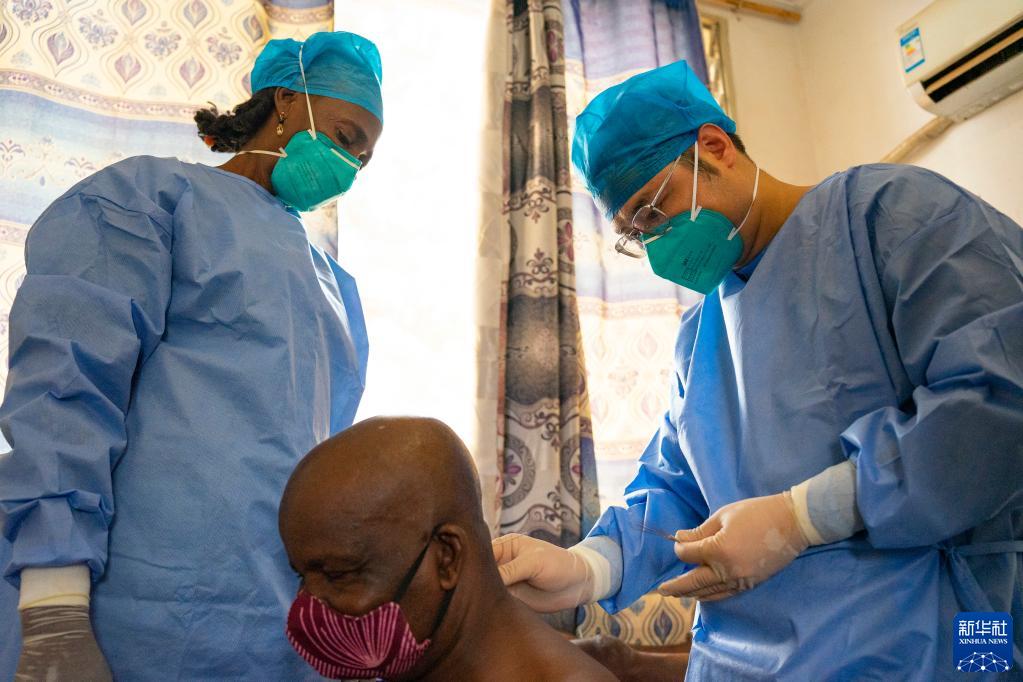 2月13日,在中非共和國首都班吉友誼醫院,第19批援中非中國醫療隊針灸科醫生郝亞波(右)為病人進行針灸治療。