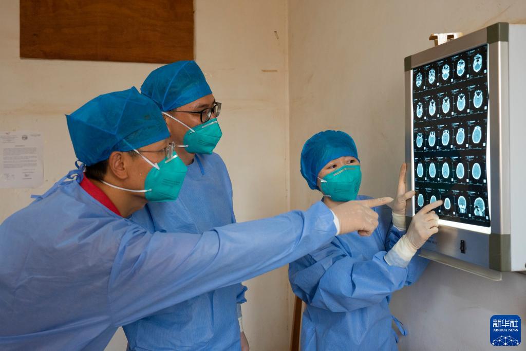 2月14日,在中非共和國首都班吉友誼醫院,第19批援中非中國醫療隊隊長、神經內科醫生王寶祥(左)與外科醫生徐言(中)、放射科醫生王佳開展多學科會診。