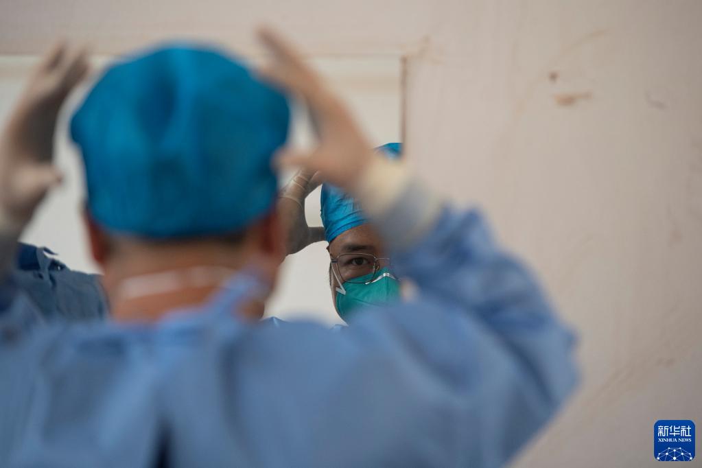 2月14日,在中非共和國首都班吉友誼醫院,第19批援中非中國醫療隊針灸科醫生郝亞波準備出診。