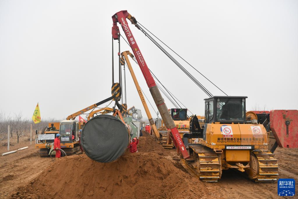 2月16日,施工人員在位于陜西省咸陽市禮泉縣的西氣東輸三線工程陜西段管道鋪設施工現場作業。
