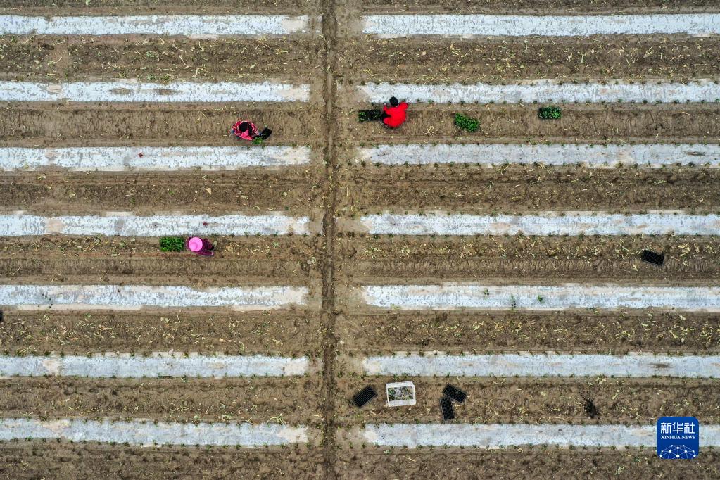 2月17日,農民在江蘇省南通市如東縣大豫鎮一處農田移栽西蘭花幼苗(無人機照片)。