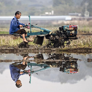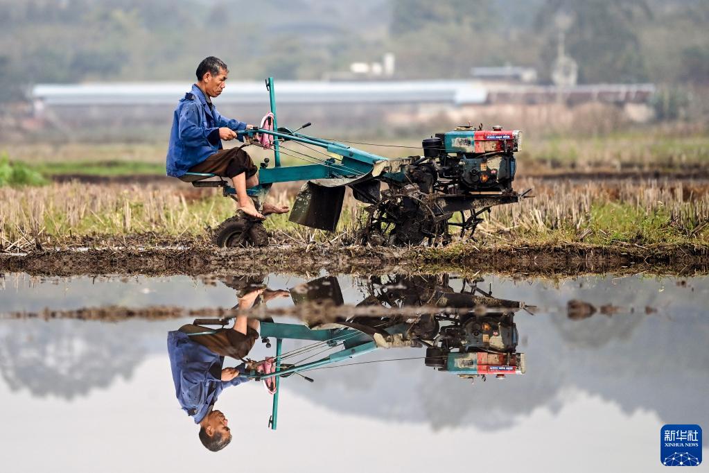 2月17日,廣西欽州市欽北區大寺鎮四聯村委那老村村民在翻耕稻田。