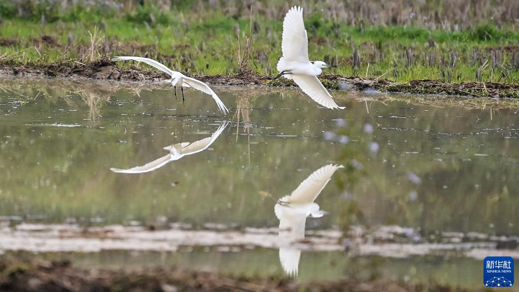 2月17日,白鷺在廣西欽州市欽北區大寺鎮四聯村委那老村已開墾的水田間覓食。