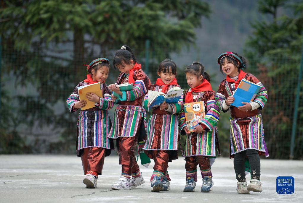 2月16日,在貴州省從江縣西山鎮中寨教學點,領到新書的瑤族學生在一起交流。