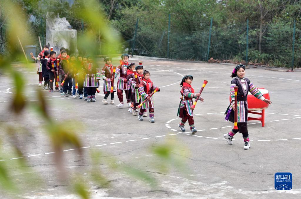 2月16日,貴州省從江縣西山鎮中寨教學點學生練習瑤族長鼓舞。