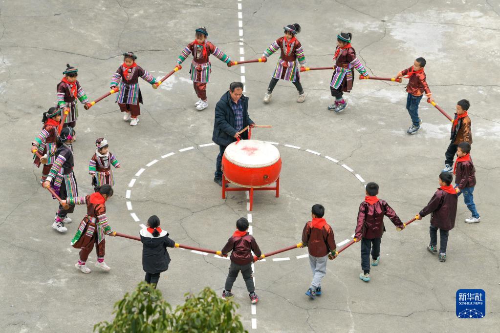 2月16日,貴州省從江縣西山鎮中寨教學點教師孟榮達(中)與學生練習瑤族長鼓舞。
