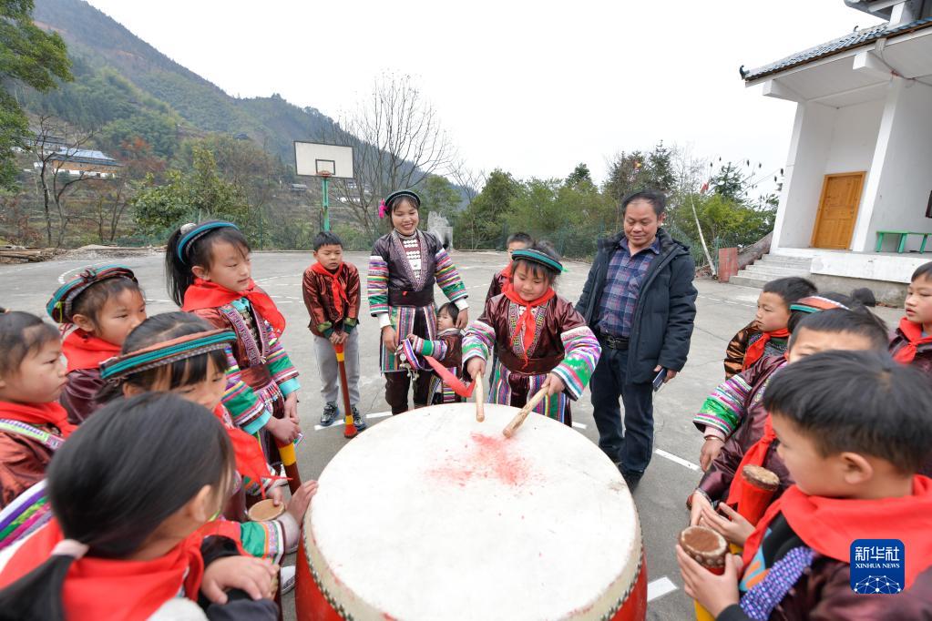 2月16日,貴州省從江縣西山鎮中寨教學點學生與傳承人、老師在民族文化課上排練瑤族長鼓舞時練習擊鼓。