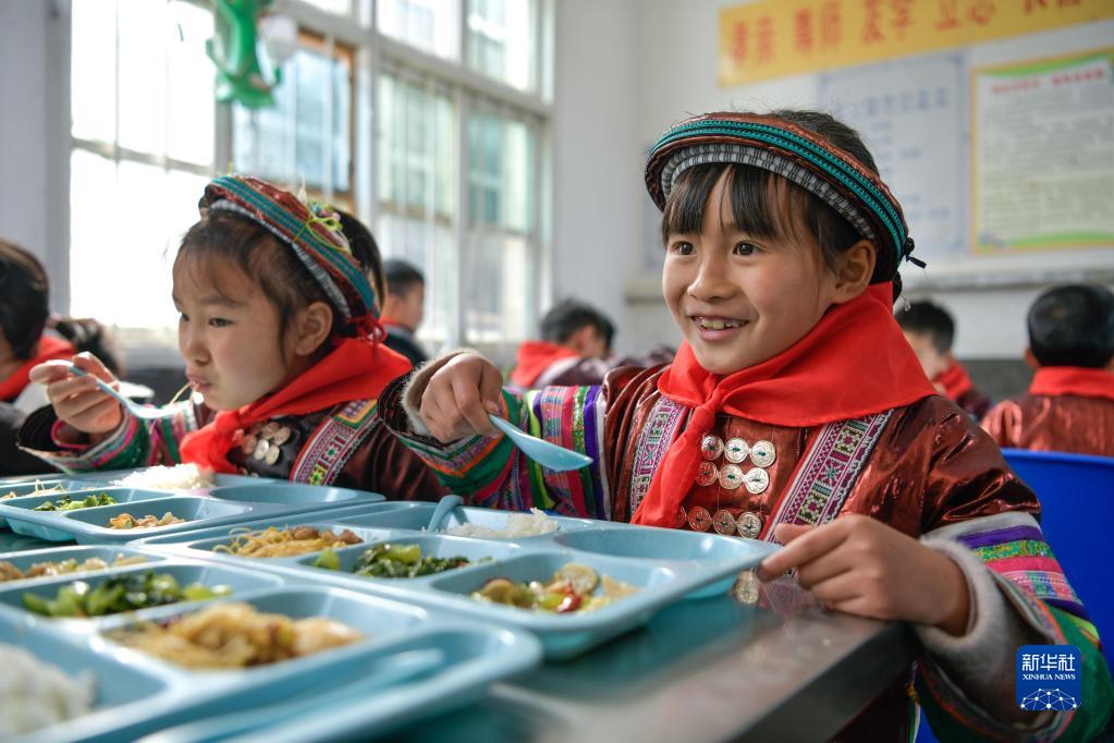 2月16日,貴州省從江縣西山鎮中寨教學點學生在享用免費營養午餐。