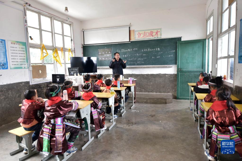 2月16日,貴州省從江縣西山鎮中寨教學點教師孟榮達給學生上課。