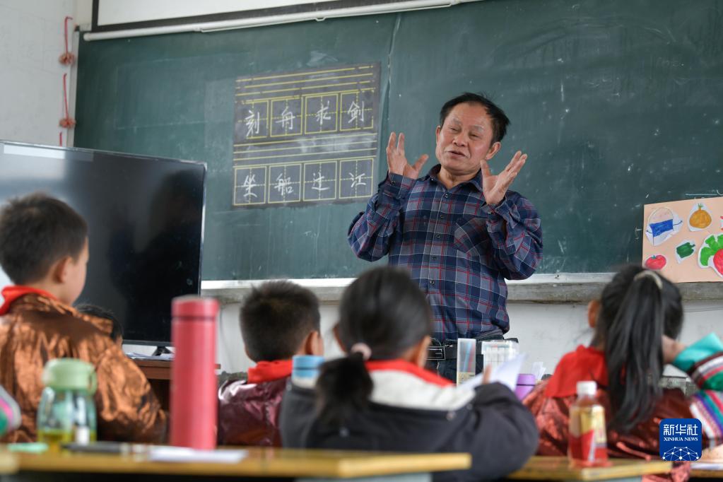 2月16日,貴州省從江縣西山鎮中寨教學點教師孟榮達給學生上課。