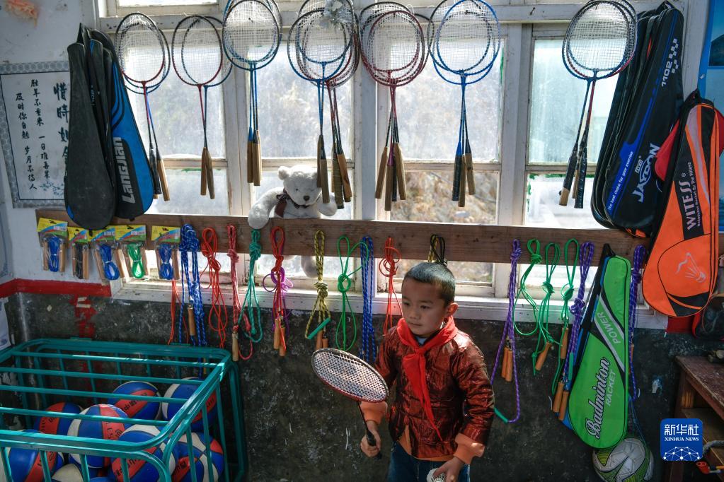 2月16日,貴州省從江縣西山鎮中寨教學點學生在體育器材角領取羽毛球拍,準備去上體育課。