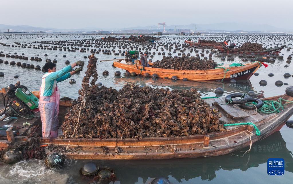 2月17日,在山東威海榮成市俚島灣養殖海區內,漁工在收獲牡蠣。