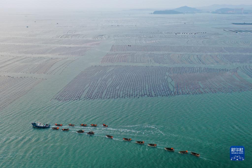 2月17日,在山東威海榮成市俚島灣養殖海區內,船只前往作業海域(無人機照片)。