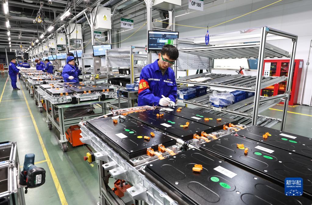 在上汽時代動力電池系統有限公司車間,工人在安裝新能源汽車動力電池系統(2月16日攝)。常州市擁有鋰電池電芯及配套生產企業120余家,動力電池產業2022年實現產值超1700億元。