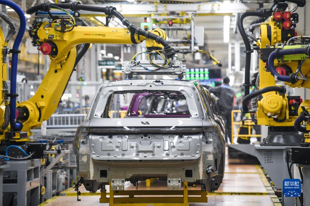 理想汽車常州基地的機器人在安裝車窗玻璃(2月15日攝)。截至2022年底,常州市新能源汽車整車年產量超34萬輛。
