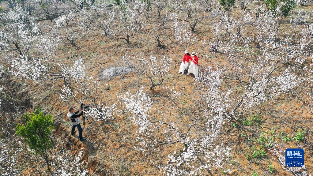 2月17日,游人在貴州省黔西南布依族苗族自治州安龍縣普坪鎮一處櫻桃基地賞花(無人機照片)。