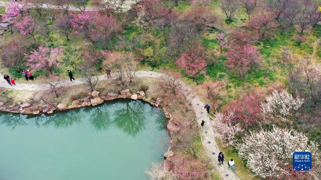 2月17日,游人在江蘇揚州瘦西湖風景區欣賞梅花(無人機照片)。