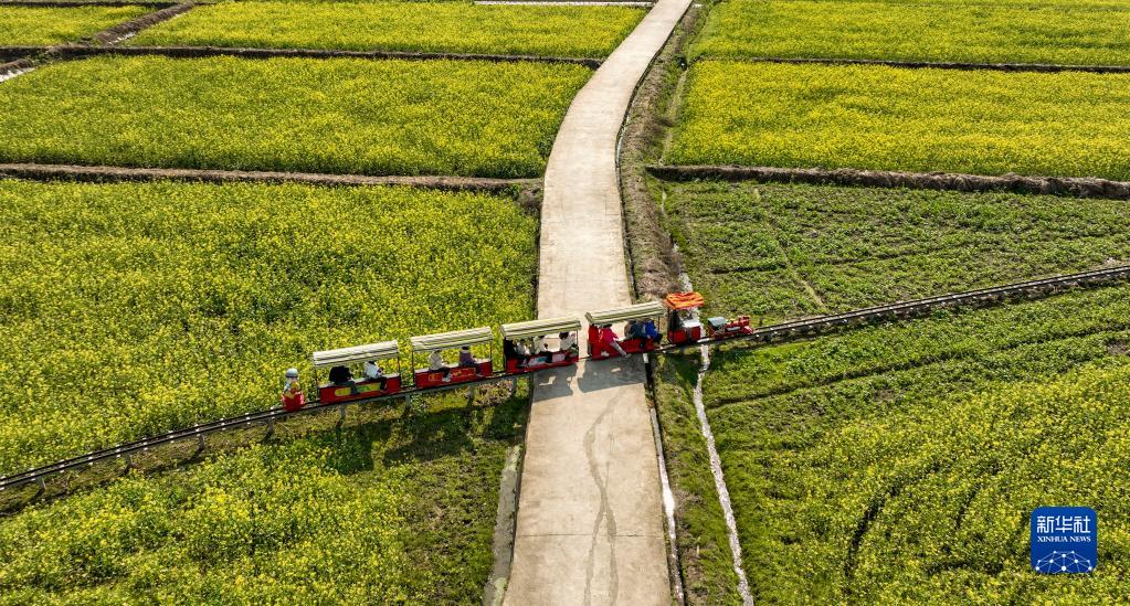 2月17日,游人乘坐觀光小火車在福建武夷山五夫鎮油菜花海游覽(無人機照片)。