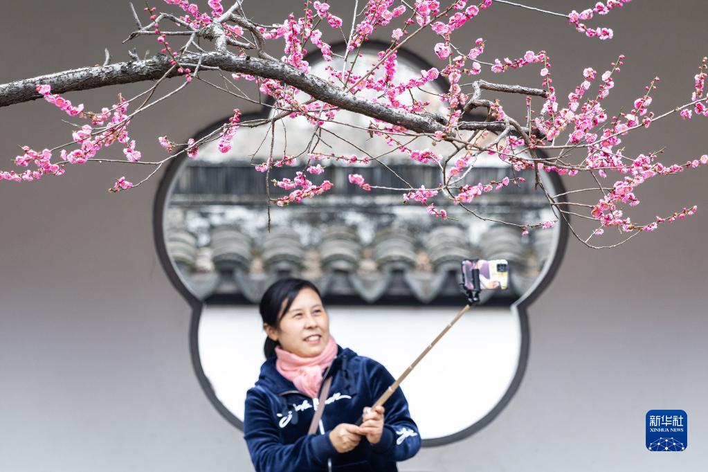 2月17日,游人在南京雨花臺風景區拍攝梅花。